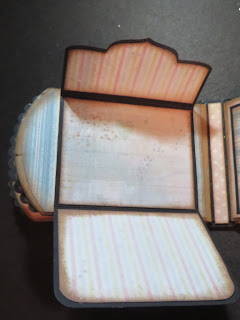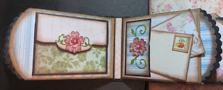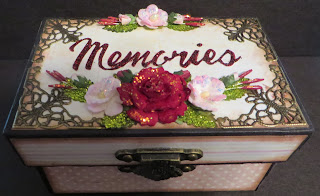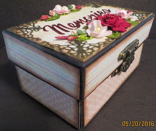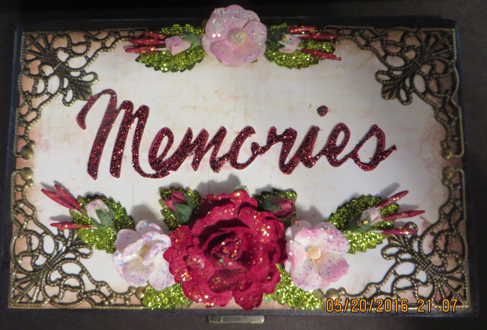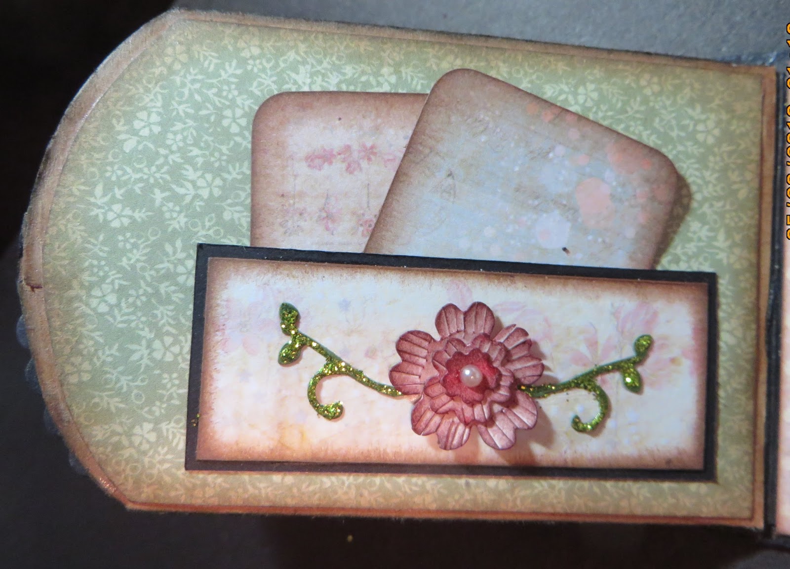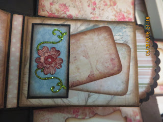 This is the outside of my little album. I added metal corners on the top and then put flowers for accent. "Memories" was cut using my Silhouette. I used a little latch to hold it closed. Of course a little stickles on the flowers is a must for me! lol