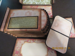 A group I am in had a challenge/swap. The challenge was to use five tiny sack for pages in a mini album. These little sacks measured about 2.75 inch x 4 inch. It was required that the bags would be the pages and each bag would hold a tag or folder. I chose to make my album into a mini drop side boxed album. I used a pattern that I had purchased from Paper Hoarder Disorder to make this album, but made it a lot smaller than the pattern size.