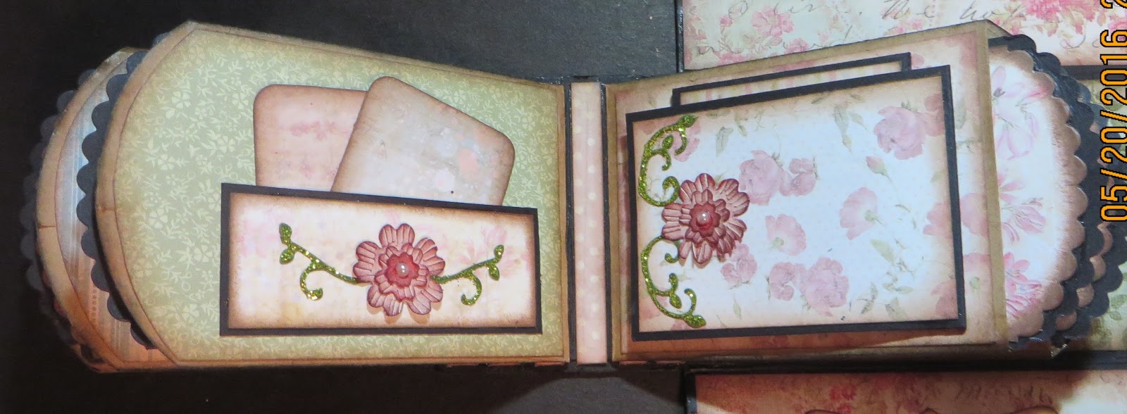 This is the outside of my little album. I added metal corners on the top and then put flowers for accent. "Memories" was cut using my Silhouette. I used a little latch to hold it closed. Of course a little stickles on the flowers is a must for me! lol